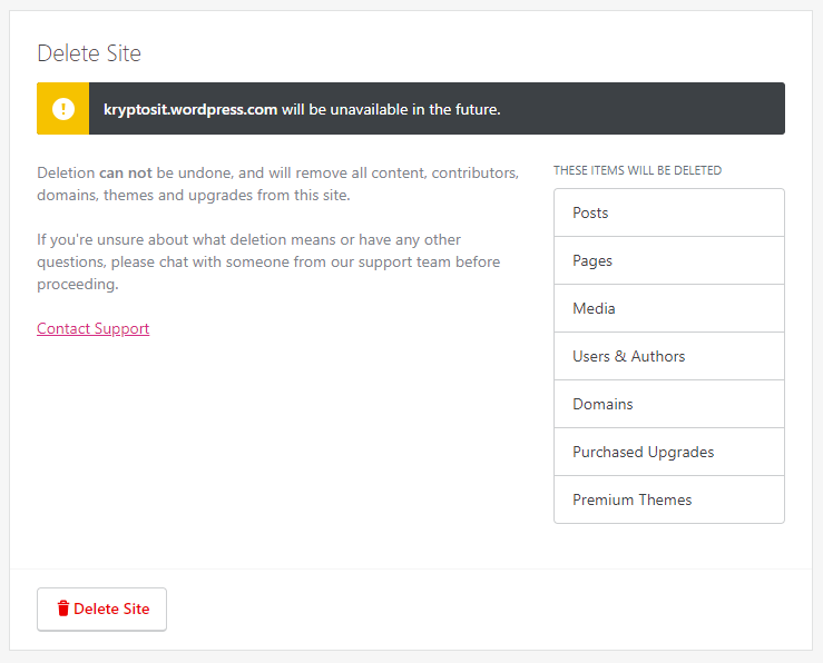 - A dialog screen will be shown warning you about the consequences of your actions, click on “Delete Site”