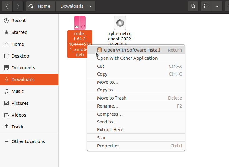 3. Go to the download folder. Right click on the file and select Open With Software Install (type your password if you are prompted for it).